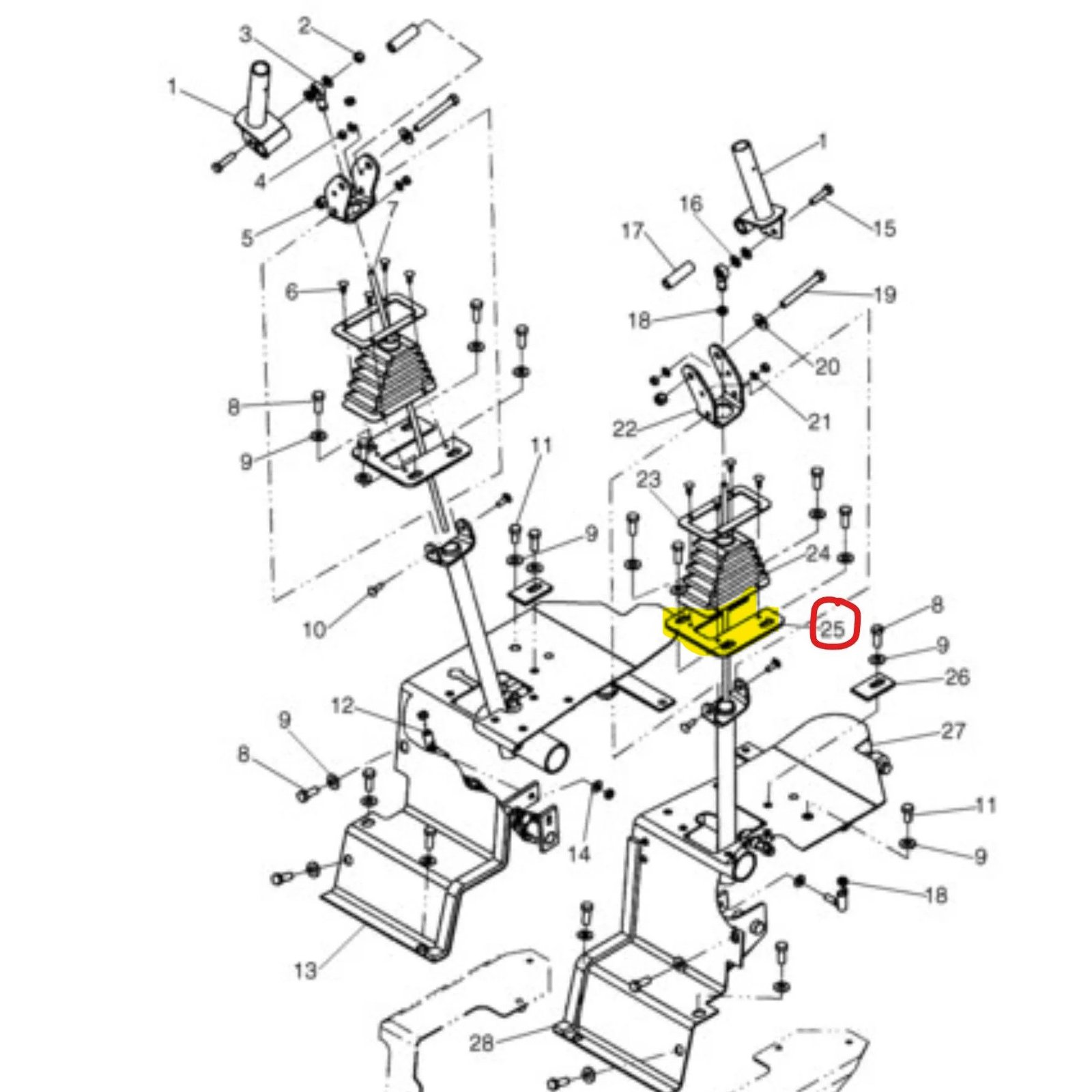 Aftermarket support plate for control handle on New Holland skid steer loaders