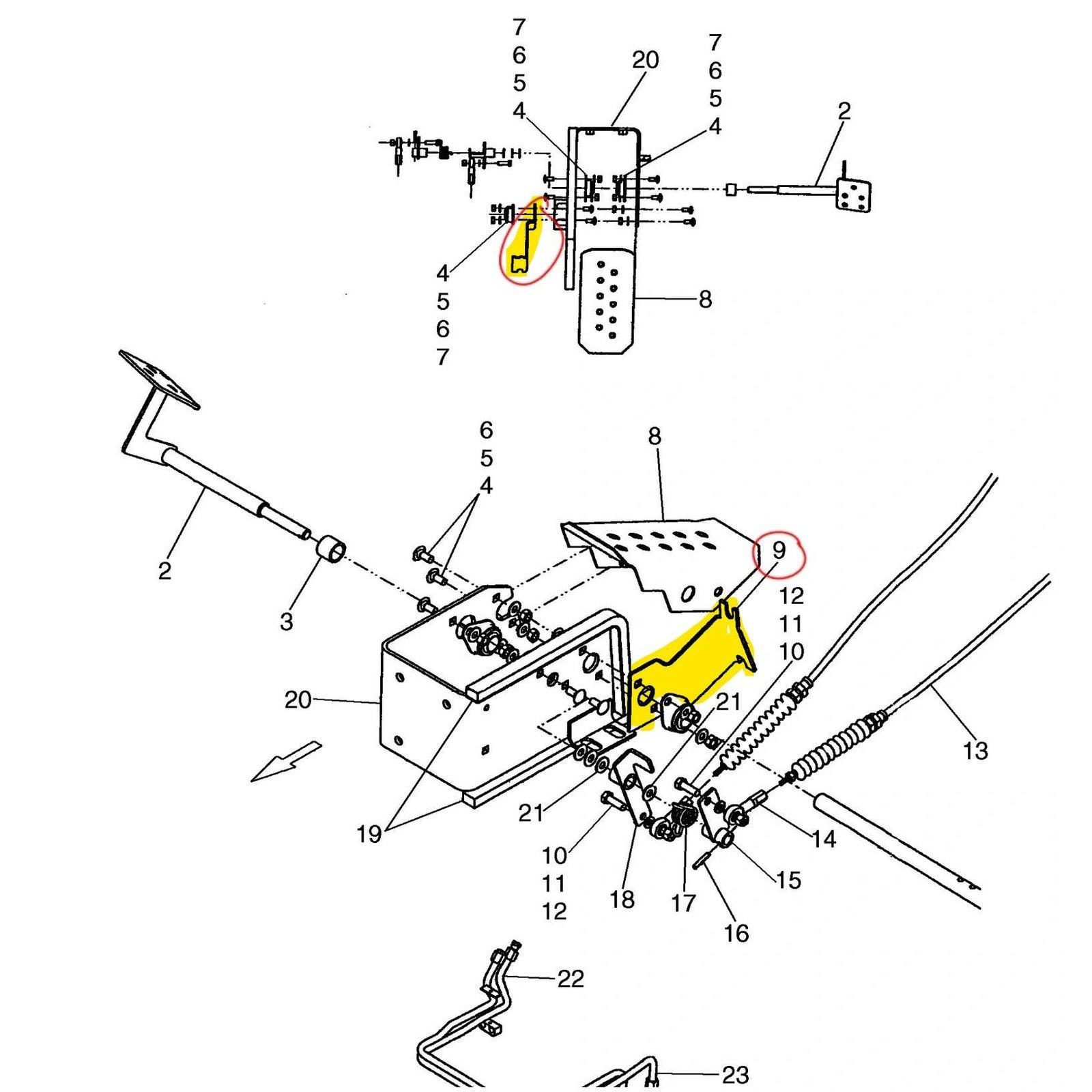 Aftermarket bracket mount for hand & foot throttle cables on skid steer loaders.