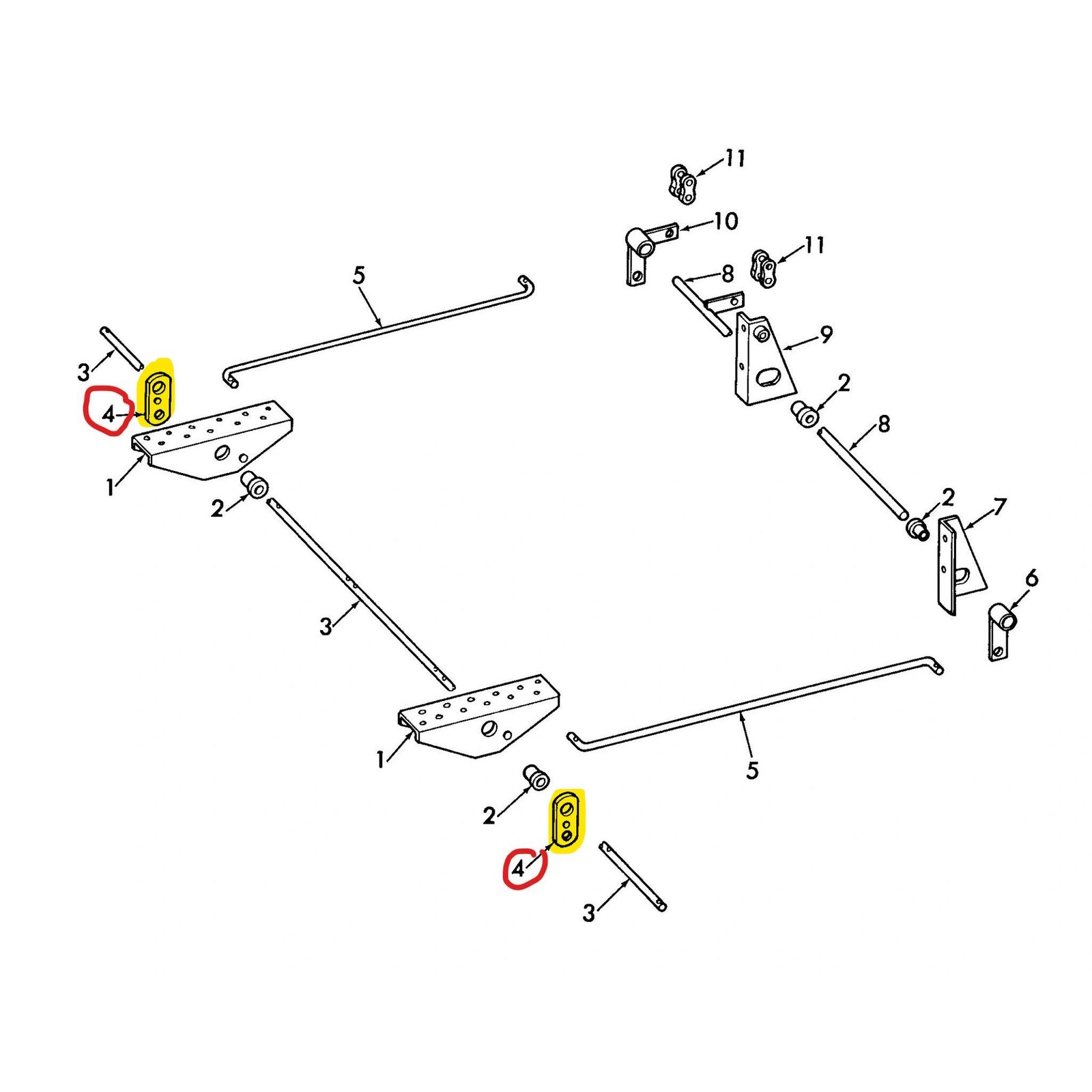 Aftermarket arm for boom and bucket control rod.on pedal For New Holland skid steer loaders, model L250 L255 LS120 LS125 L120 L125 L225 L325 L425 L445 L451 L452 L454 L455 Reference # 4 Part # 251968 *Part is powder coated bright yellow